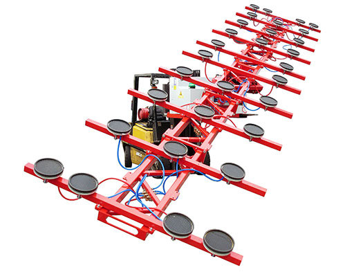 • Gabelstapler-Manipulator mit integrierten Hydraulikfunktionen für die horizontale und vertikale Verlegung von Wandelementen, sowie für die Verlegung von Deckenelementen